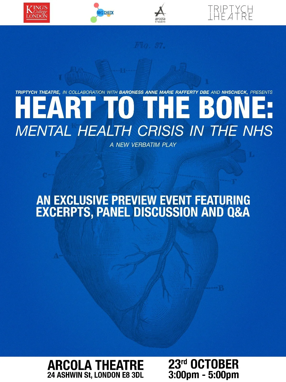 NHSCHECK is the largest study ever conducted into the mental health of the NHS, inclusive of agency and non-clinical staff. Led by King’s College London and involving over 23,000 participants across eighteen NHS Trusts, the programme was launched during the COVID-19 pandemic to track the psychological wellbeing of healthcare workers in real time, from hospital porters to senior clinicians. Unlike most research of its kind, NHSCheck combines quantitative surveys with in-depth qualitative interviews, offering both statistical insight and rich, human stories. One of its most striking findings is that over 28% of NHS workers reported experiencing morally injurious events; moments where they felt forced to act against their values, often leading to PTSD-like symptoms, burnout, or emotional detachment. It was this revelation that prompted a sub-study: 50 recorded interviews exploring the lived experience of moral injury in detail. Heart to the Bone draws its text verbatim from these interviews. NHSCheck provided not just the data, but the ethical framework and trust relationships that made this theatrical translation possible.
